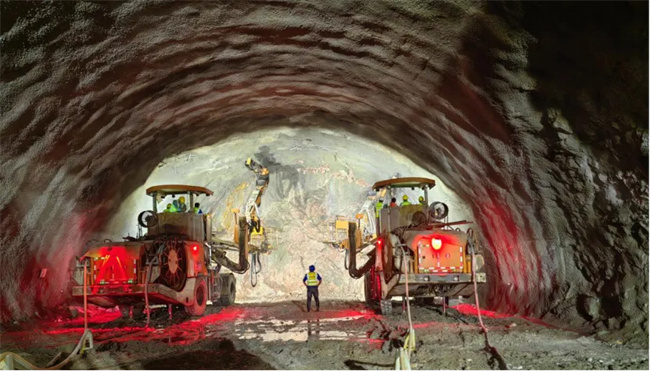 膠州灣二隧3標(biāo)項(xiàng)目全長(zhǎng)7094.5米,由中鐵隧道局集團(tuán)有限公司承建。該段地層以花崗巖為主,強(qiáng)度較高,需采用爆破法施工。志高機(jī)械研發(fā)生產(chǎn)的地下三臂臺(tái)車——UJ33在鉆孔過(guò)程在發(fā)揮了重要作用。它機(jī)載177 kw康明斯發(fā)動(dòng)機(jī),動(dòng)力強(qiáng)勁;同時(shí)搭配ZY104M鑿巖機(jī),鉆具損耗小,使用壽命長(zhǎng)。每臺(tái)設(shè)備都有三條工作臂,兩臺(tái)設(shè)備同時(shí)工作,六條工作臂在不同方向和位置鉆孔,提高了鉆孔效率,為保證工程進(jìn)度保駕護(hù)航。