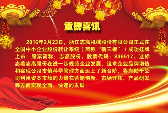 重磅喜訊:浙江志高機(jī)械股份有限公司成功掛牌“新三板”